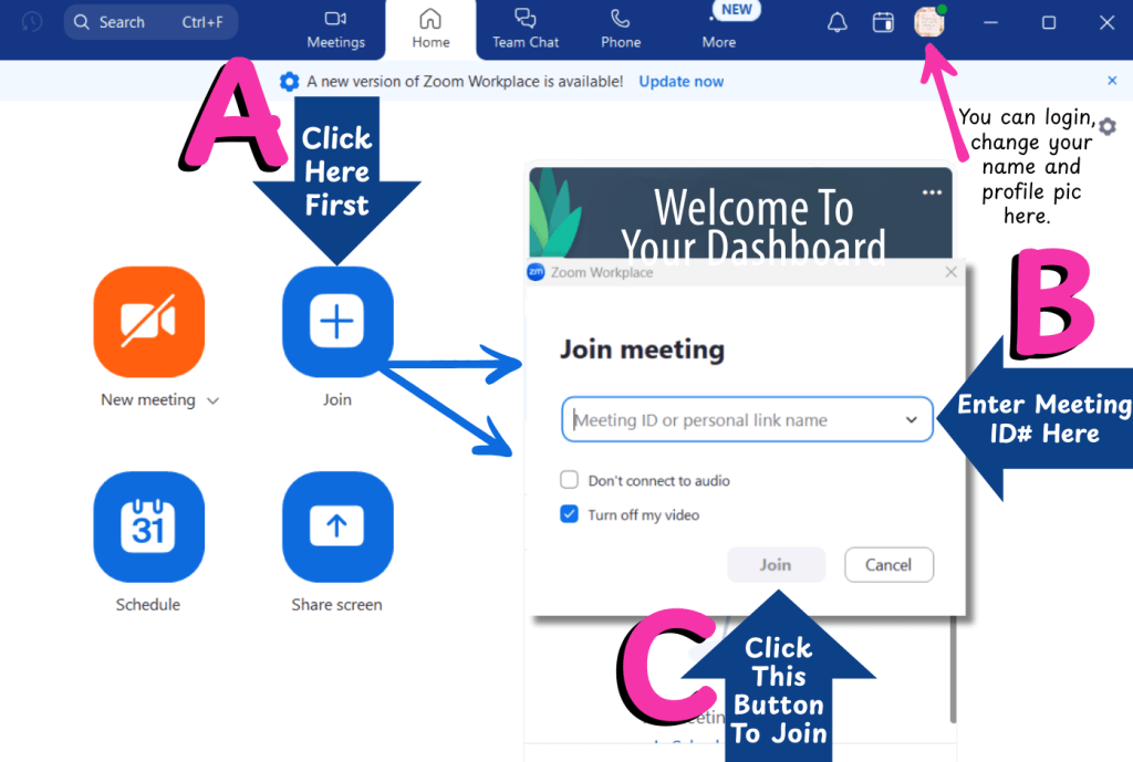 You may need to enter a password, click past any welcome window and decide if you’d like your camera on (off is ok too), and click one final “Join”